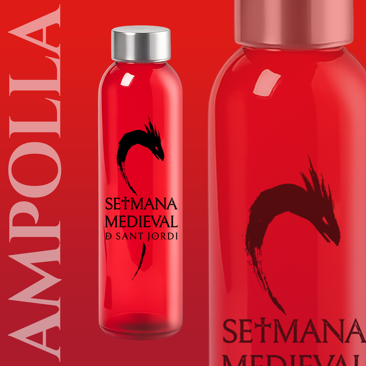 Ampolla reutilitzable vermella amb el drac de la Setmana Medieval de Sant Jordi en negre. Lleugera i pràctica, perfecta per portar aigua a tot arreu amb un toc icònic i medieval.