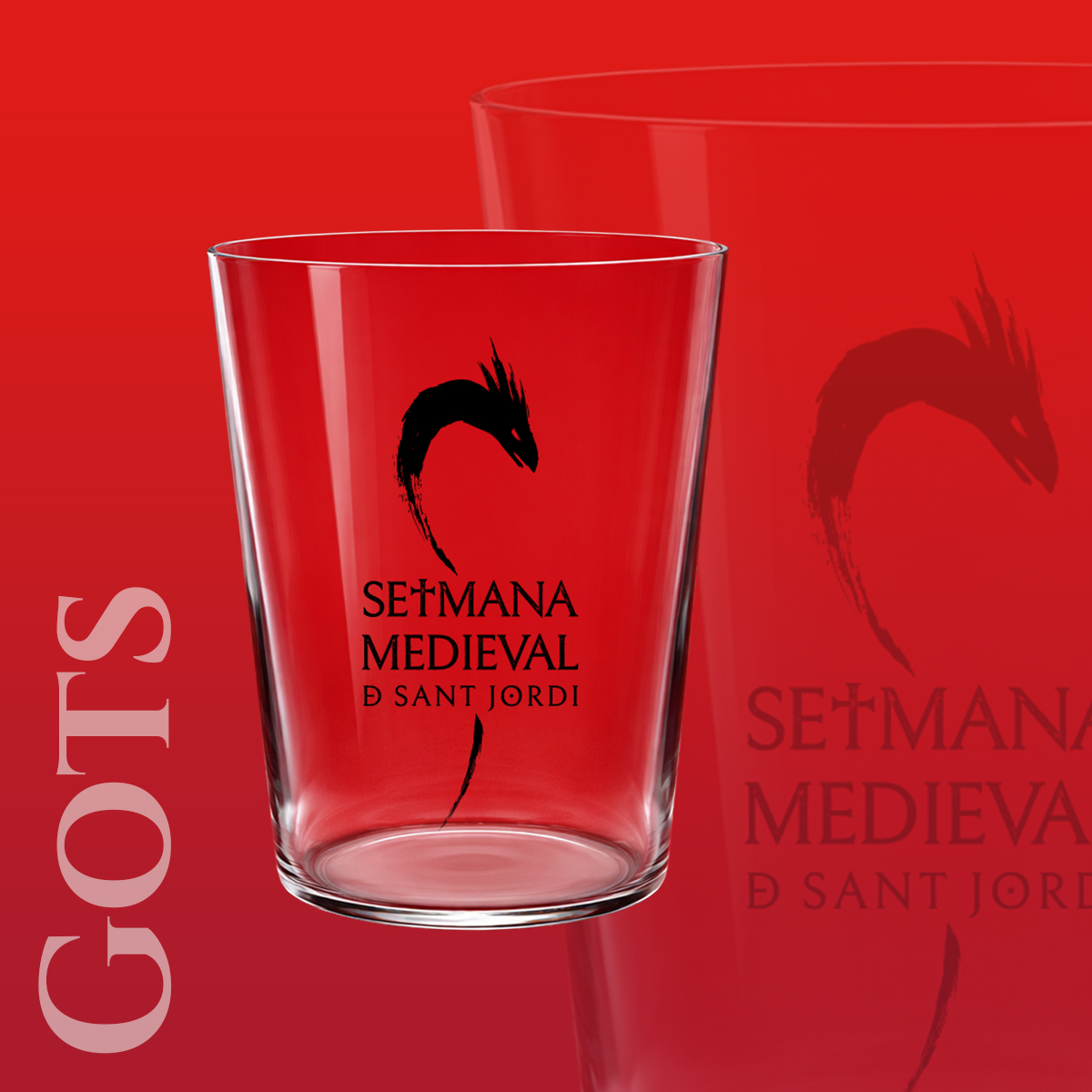 Ampolla reutilitzable vermella amb el drac de la Setmana Medieval de Sant Jordi en negre. Lleugera i pràctica, perfecta per portar aigua a tot arreu amb un toc icònic i medieval.